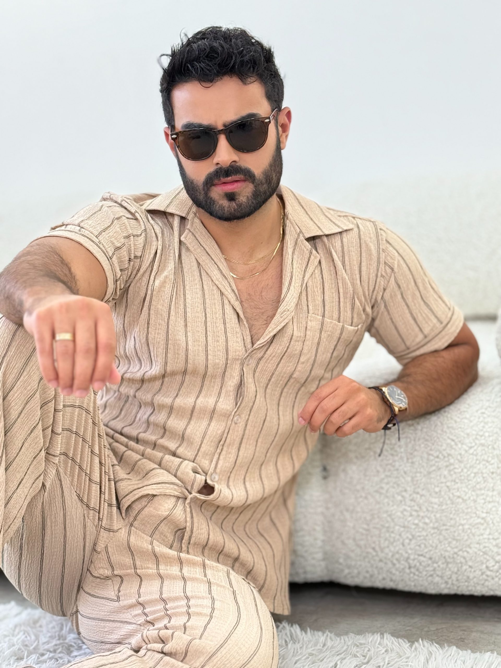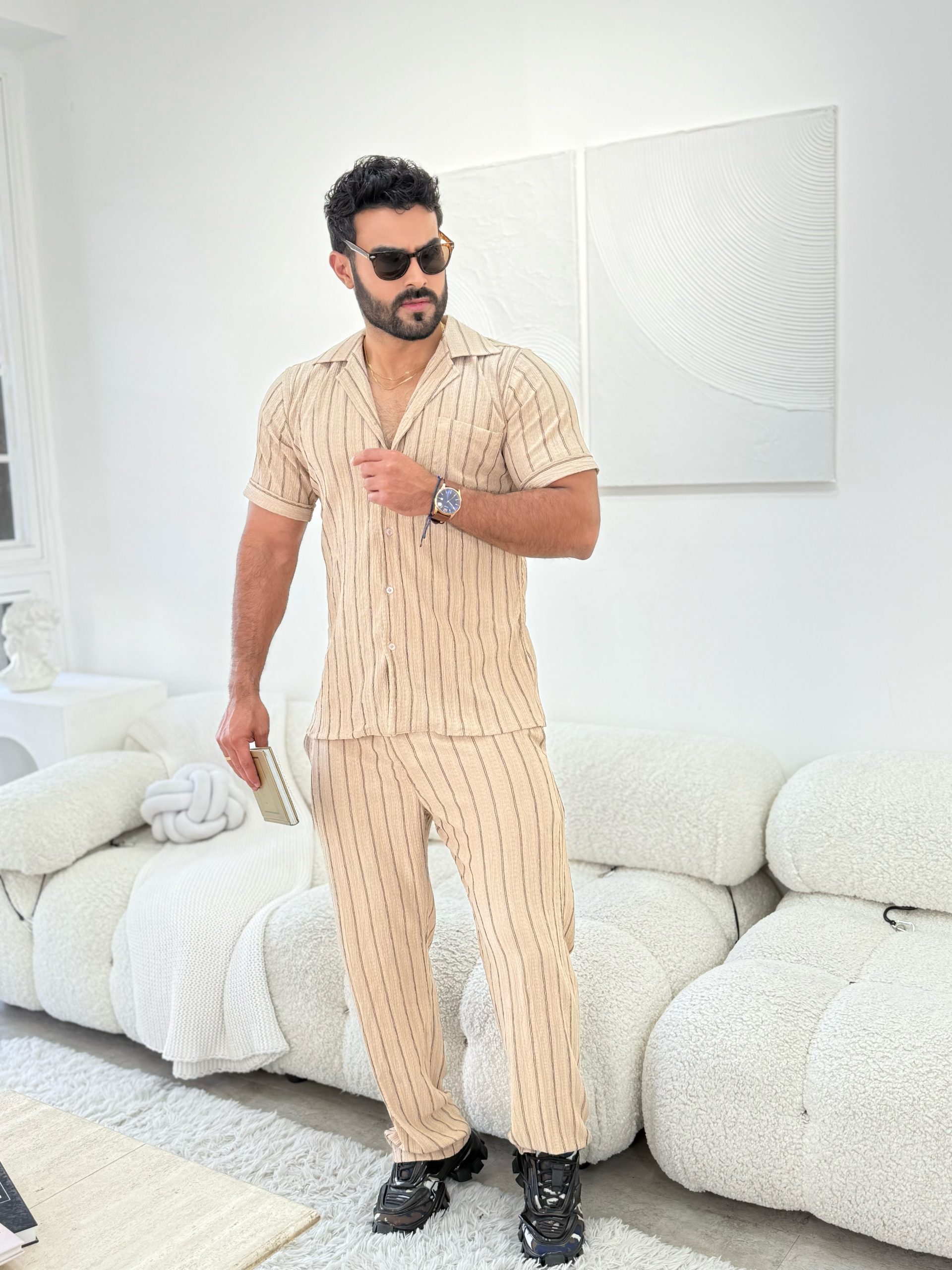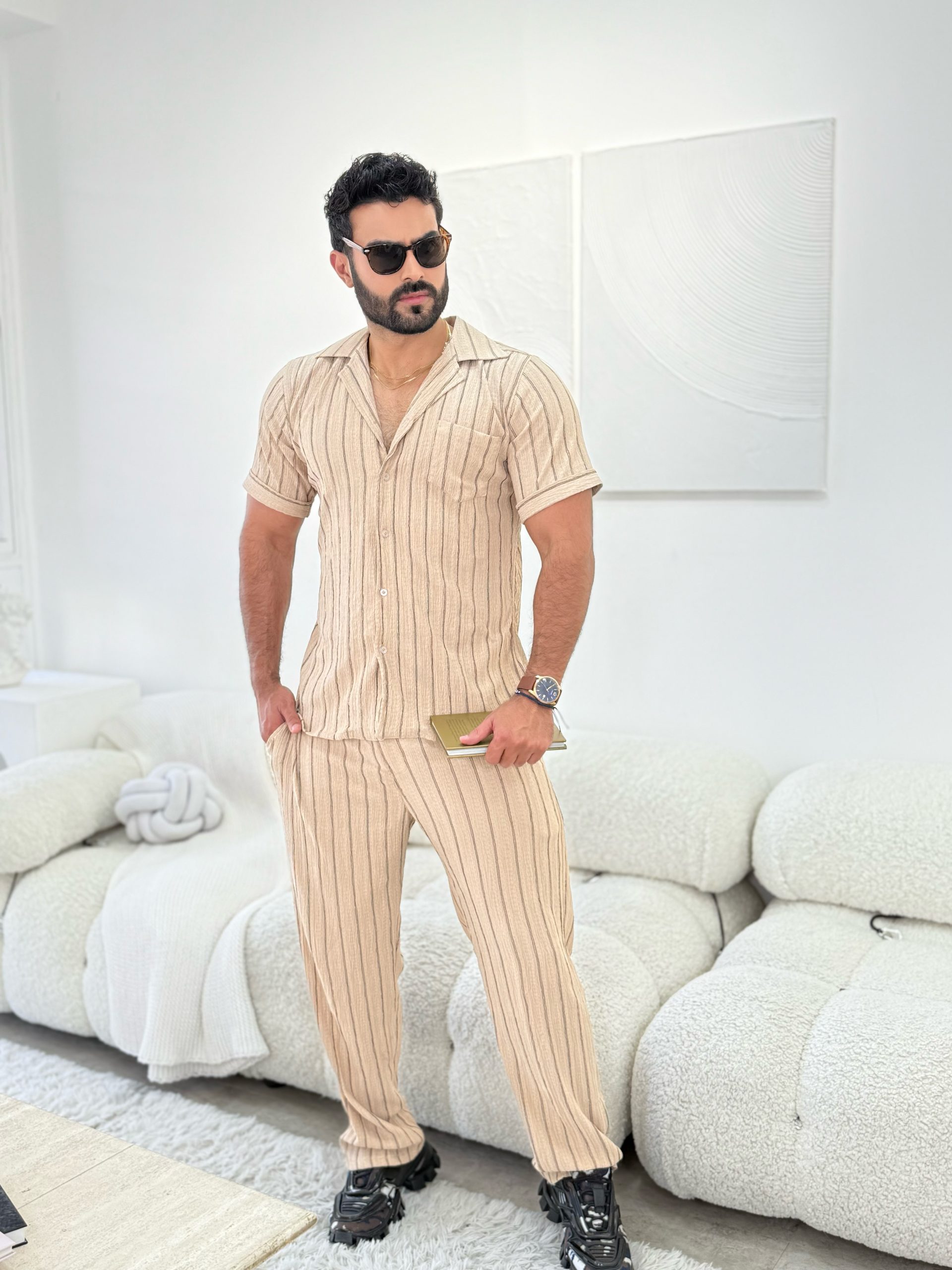 Este set combina un fondo marrón cálido con sutiles rayas negras que estilizan la silueta y aportan profundidad al diseño. Confeccionado en una tela ligera y cómoda, es ideal para quienes buscan diferenciarse con una prenda original, sin perder sobriedad.